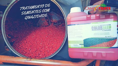 Tratamento de sementes, realizado com ADESIVO, COLORSEED, para garantir a melhor qualidade em seu tratamento com melhor uniformidade, aderência e resistência a umidade do solo.